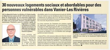 À la suite d'une annonce faite par le gouvernement du Québec, 30 nouveaux logements sociaux et abordables pour les jeunes en difficulté verront le jour sur le boulevard Hamel dans #VanierLesRivières, grâce à l'organisme Le Piolet ! Je suis très fier d'avoir pu annoncer ce projet dans notre circonscription.